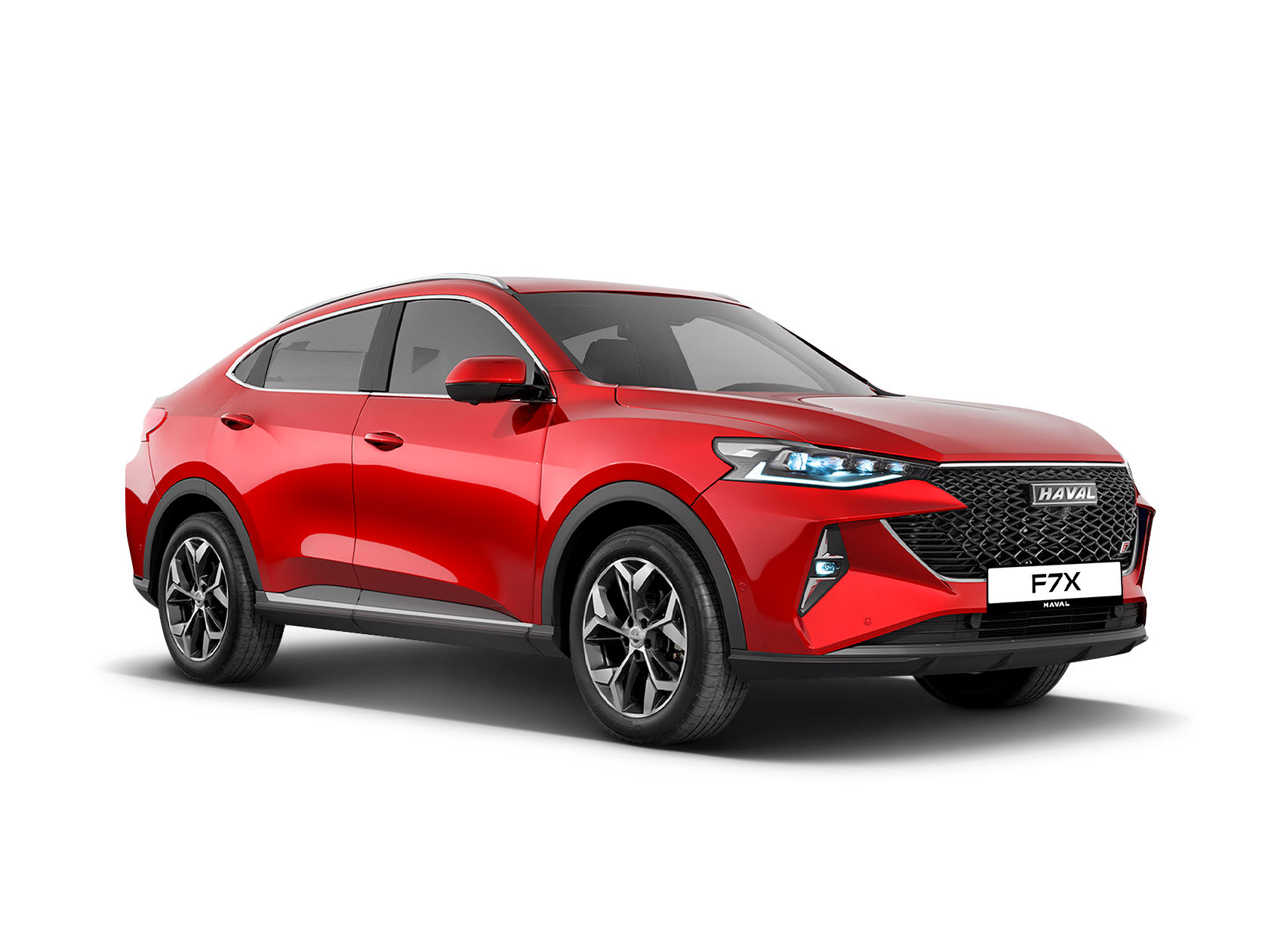 Снаружи HAVAL F7X сохраняет характерные черты купе-кроссовера: покатая линия крыши, приподнятая линия остекления и компактные свесы придают кузову стремительный силуэт. Передняя часть оформлена крупной фирменной решеткой радиатора, к которой примыкают узкие светодиодные фары.